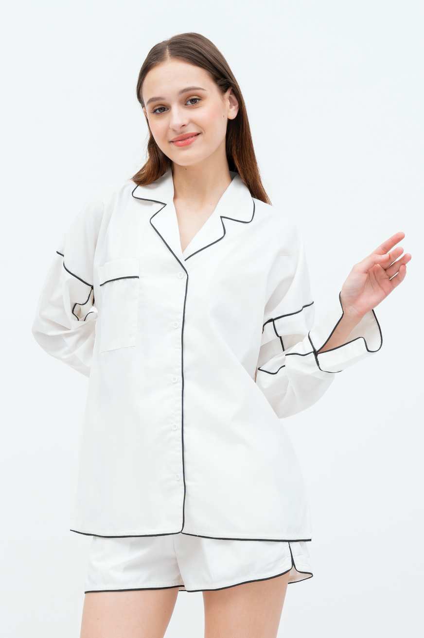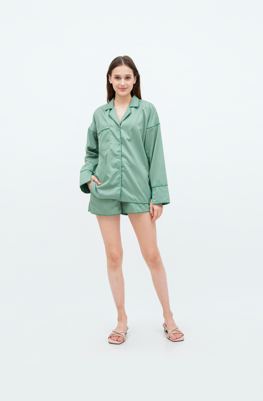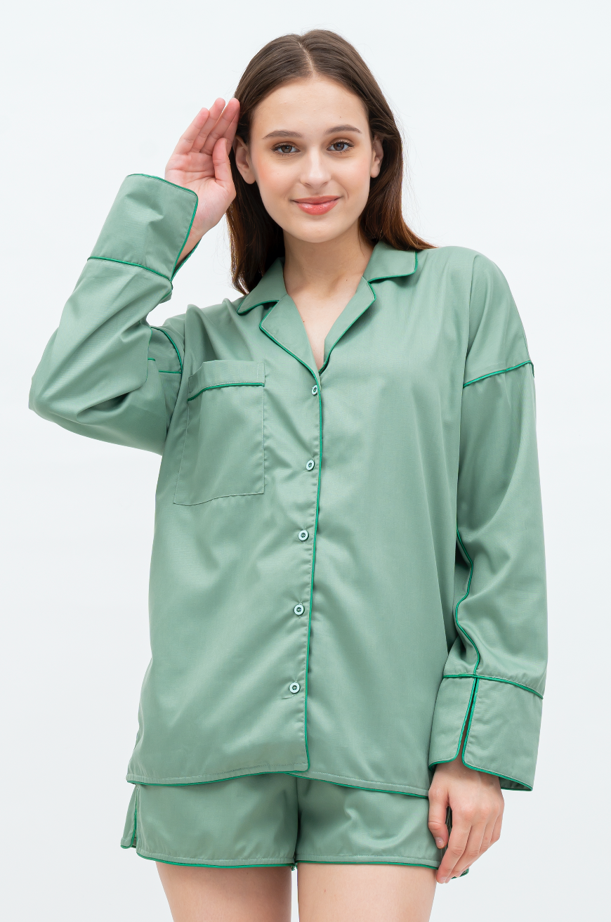 Catalina long sleeve set (White/Green/Yellow) is stylish and yet soft pyjama set, made for relaxing in style. Beautiful detail on the clothes makes it more stylish and pocket both sides of the pant.