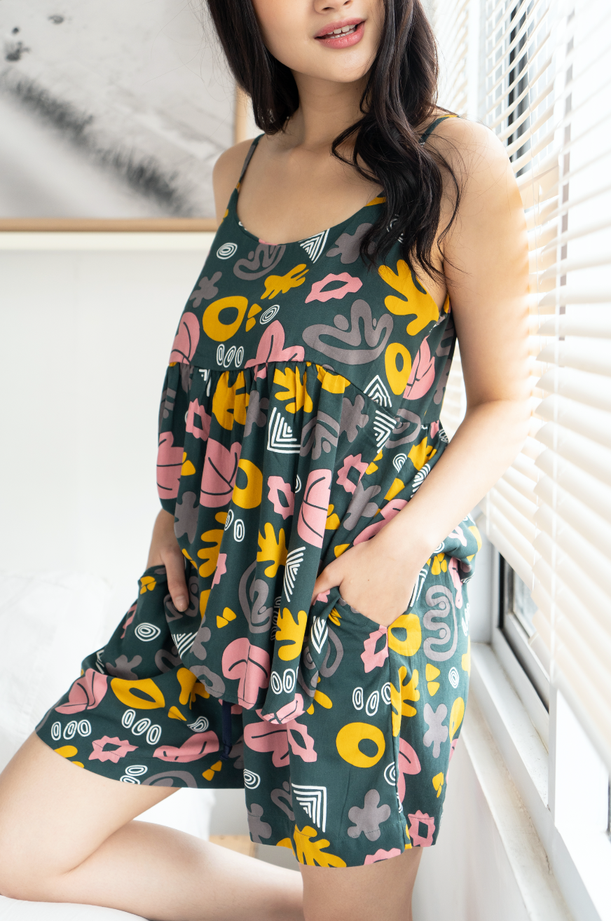 Dark Green abstract with cartoon leaf’s Cami set which is perfect for bed, bringing out the perfect combination of style and comfort.